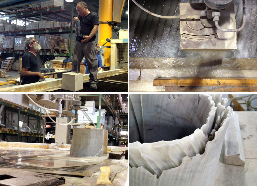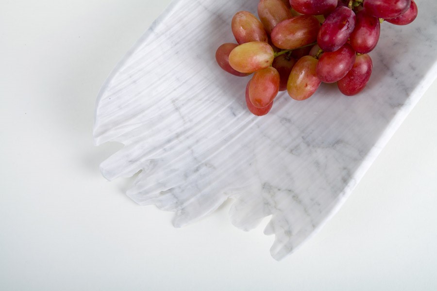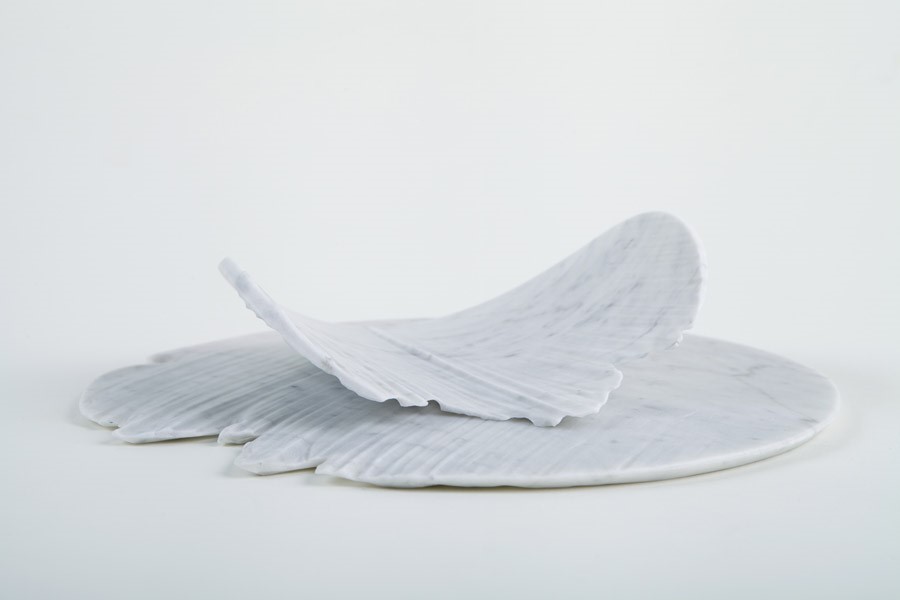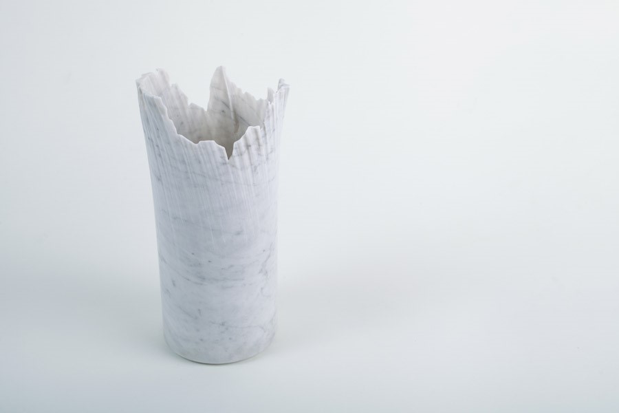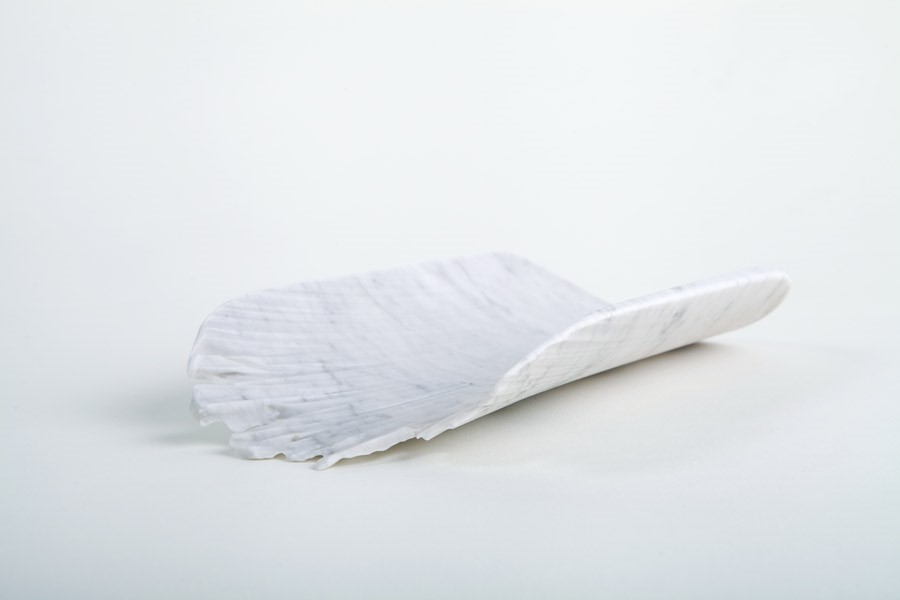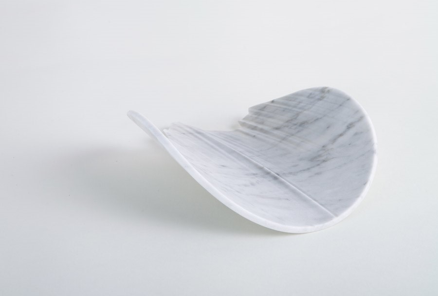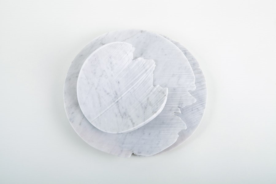 The project includes a set of carrara marble objects: serving plates and vessels that examines the morphology of rock shaped by water.
