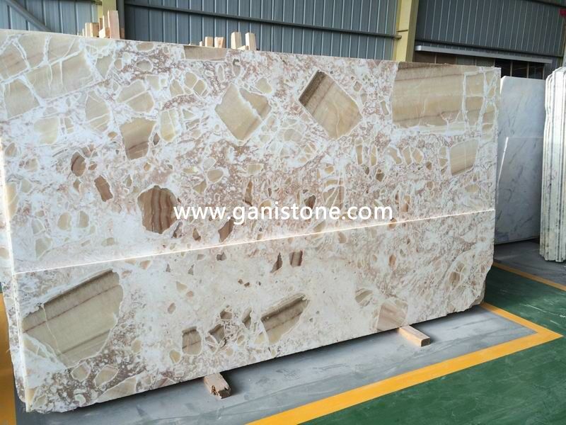 Onyx, a form of quartz, is one of the more popular precious gemstone materials. Gani Onyx has naturally beautiful translucence and line of contrasting colors running throughout which defines the unique color characteristics of the stone. Onyx colors are soft, opulent, and almost fragile in nature. Onyx tile is truly a premium surface material. Onyx tiles require some care, but with a little maintenance you can keep them looking brand new for years. If you are looking for something distinctive, consider onyx tile for your flooring surfaces. Gani Stone Onyx can be applied to flooring,wall fa?ade, vanity tops, columns, carvings, stairs, wall ledge stone veneer, water jet medallion, mosaic, window sills, etc..