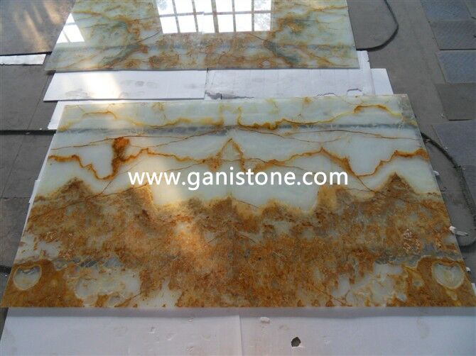 Onyx, a form of quartz, is one of the more popular precious gemstone materials. Gani Onyx has naturally beautiful translucence and line of contrasting colors running throughout which defines the unique color characteristics of the stone. Onyx colors are soft, opulent, and almost fragile in nature. Onyx tile is truly a premium surface material. Onyx tiles require some care, but with a little maintenance you can keep them looking brand new for years. If you are looking for something distinctive, consider onyx tile for your flooring surfaces. Gani Stone Onyx can be applied to flooring,wall fa?ade, vanity tops, columns, carvings, stairs, wall ledge stone veneer, water jet medallion, mosaic, window sills, etc..
