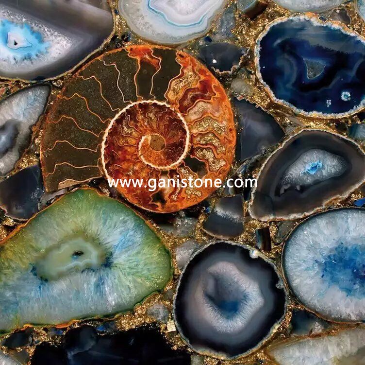 We have a wide range of semi precious stone types for selection, such as agate, aventurine, cat’s eye, chrysanthemum, labradorite, lapis lazuli, malachite, quartz, ox horn, petrified wood, sapphire, solalite blue jasper, tiger eye blue yellow, violet fluorite, zebra stone, red coral stone, amethyst, blue astroies, golden star gemstone, iron tiger eye, red jasper, turquoise, etc.. Each semi-precious stone is individually cut and bound together with an epoxy resin to create not only stunning slabs, but true works of art. They’re ideal for high end project and our clients love to use then for decorating luxury hospitality, villa, commercial project, etc..