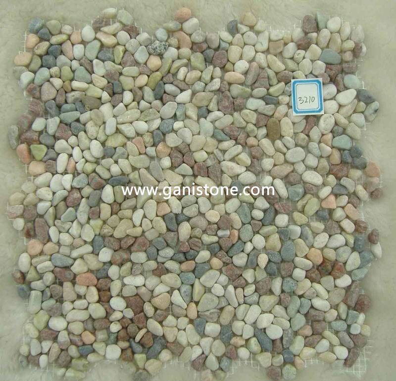 • Product description: Pebble tiles from Gani Stone feature smooth polished stones mounted to a flexible mesh backing for easy installation.