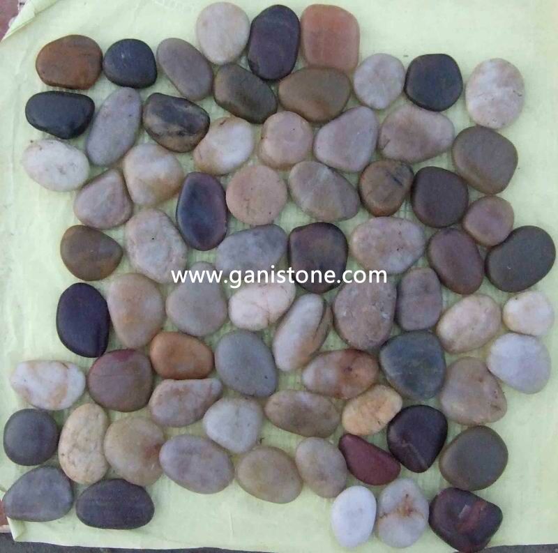 • Product description: Pebble tiles from Gani Stone feature smooth polished stones mounted to a flexible mesh backing for easy installation.