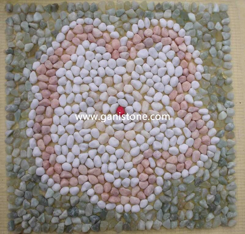 • Product description: Pebble tiles from Gani Stone feature smooth polished stones mounted to a flexible mesh backing for easy installation.