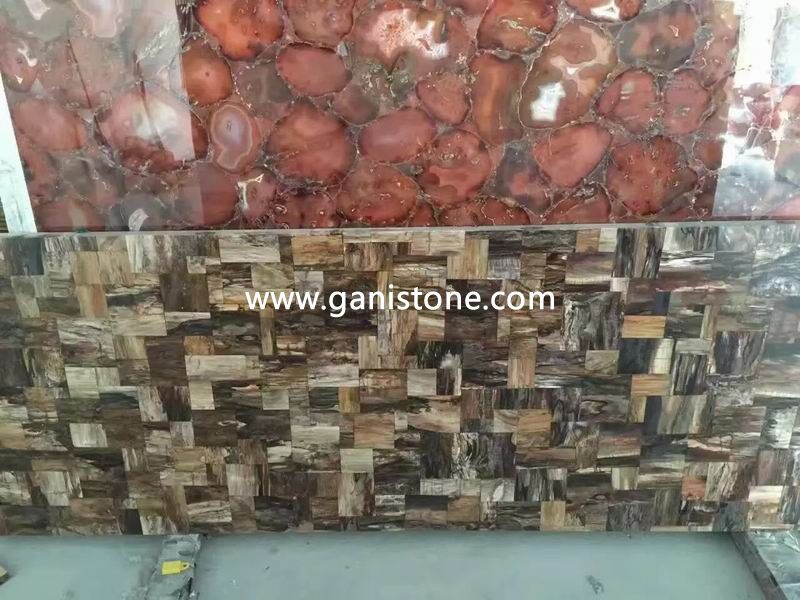We have a wide range of semi precious stone types for selection, such as agate, aventurine, cat’s eye, chrysanthemum, labradorite, lapis lazuli, malachite, quartz, ox horn, petrified wood, sapphire, solalite blue jasper, tiger eye blue yellow, violet fluorite, zebra stone, red coral stone, amethyst, blue astroies, golden star gemstone, iron tiger eye, red jasper, turquoise, etc.. Each semi-precious stone is individually cut and bound together with an epoxy resin to create not only stunning slabs, but true works of art. They’re ideal for high end project and our clients love to use then for decorating luxury hospitality, villa, commercial project, etc..