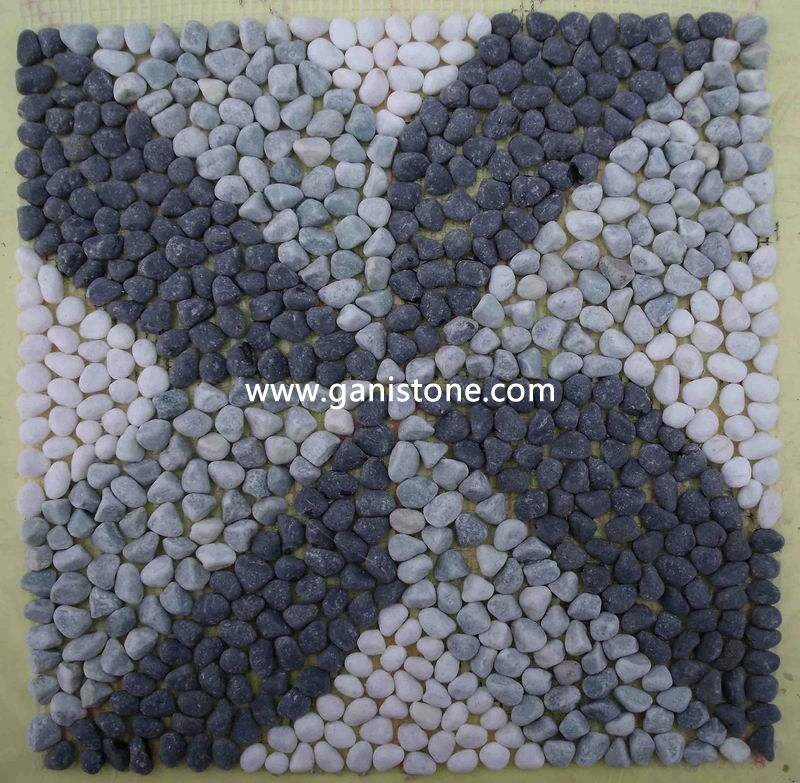 • Product description: Pebble tiles from Gani Stone feature smooth polished stones mounted to a flexible mesh backing for easy installation.