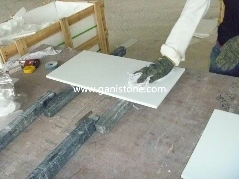 Crystal White is pure white crystallized glass. This unique building material is made using a very sophisticated technique of sintering select minerals and fusing the sintered crystals together through intense high temperature. The result is a versatile building material that is nearly identical to Pure White Thassos Marble, yet unlike Thassos it is as hard as granite and never requires sealing.
