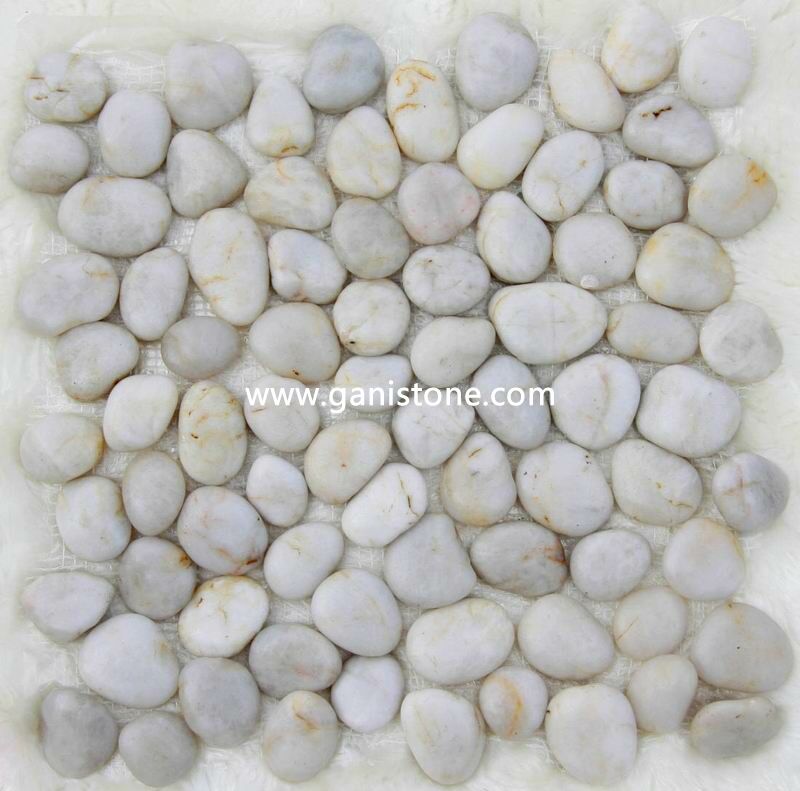 • Product description: Pebble tiles from Gani Stone feature smooth polished stones mounted to a flexible mesh backing for easy installation.
